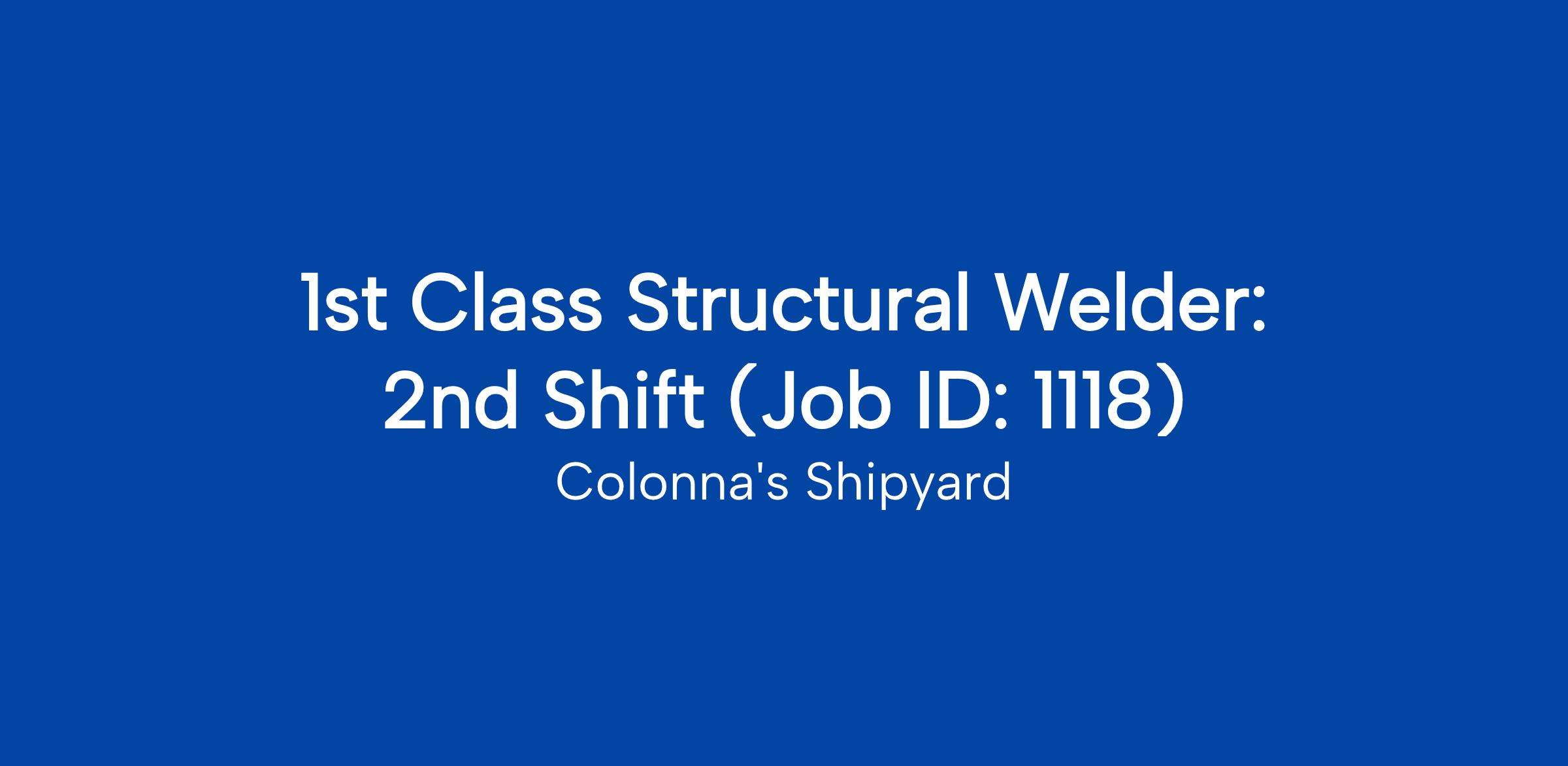 Colonna's Shipyard, is seeking a 1st Class Structural Welder to support 2nd Shift operations in our Shipyard in Norfolk, VA.